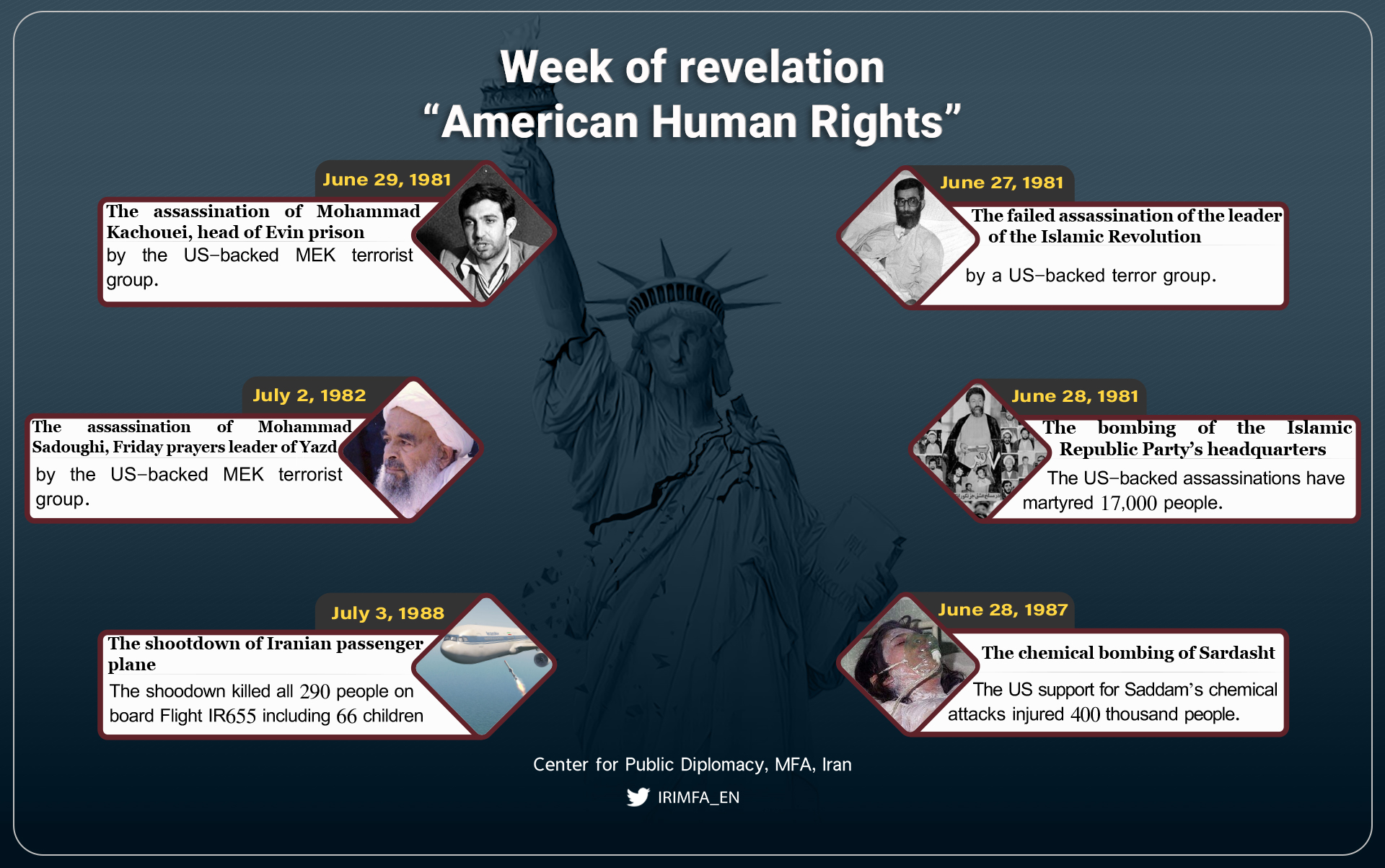 미국 인권 폭로 주간(6월 27일 ~7월 3일)은 미국과 동맹국들을 영원히 규탄하기에 충분한 범죄로 가득합니다. 이란 국민들은 인권을 수호한다면서도 인간의 권리와 존엄을 무시하는 미국과 서방의 위선을 결코 잊지 않을 것입니다.